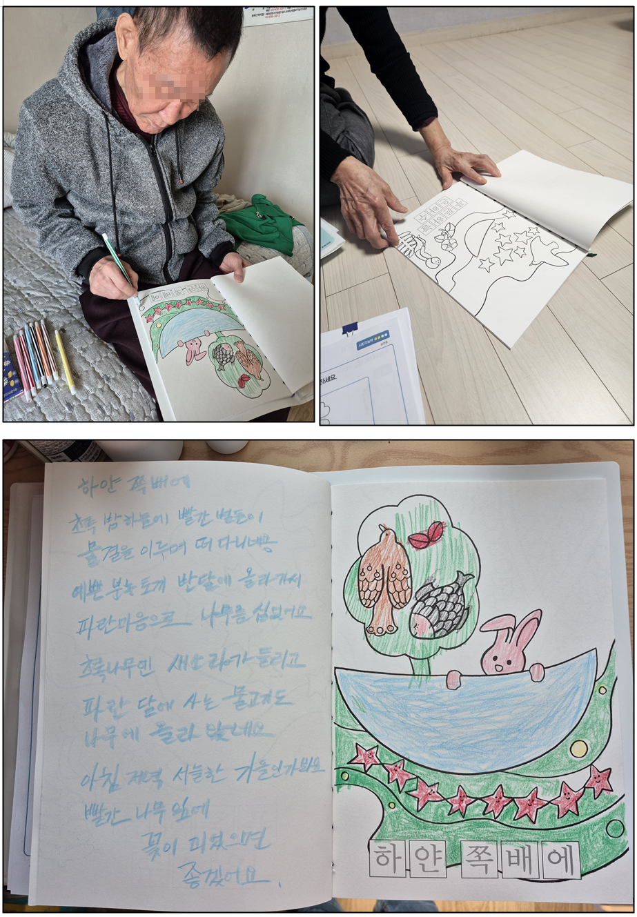 비영리사단법인 세상아이에서 보내주신 색칠공부책을 수령하여 재가 어르신 가정을 방문할 때마다 한권씩 직접 전달하였습니다. 색칠공부책을 받아보신 어르신들께서는 표지의 곱고 따뜻한 그림을 보시며 "이게 뭐꼬? 너무 곱고 예쁘네."라고 하시며 책을 손으로 쓰다듬었습니다. 또한 "이걸 만든 학생들이 참 정성이 많네. 고맙다."며 감사의 마음을 전하셨습니다. 많은 어르신들이 "색칠하기 아깝다.", "이야기책을 색칠하는 것 같다."며 즐거워하셨고, 일상의 활력과 위로를 얻는 시간으로 삼고 계십니다.