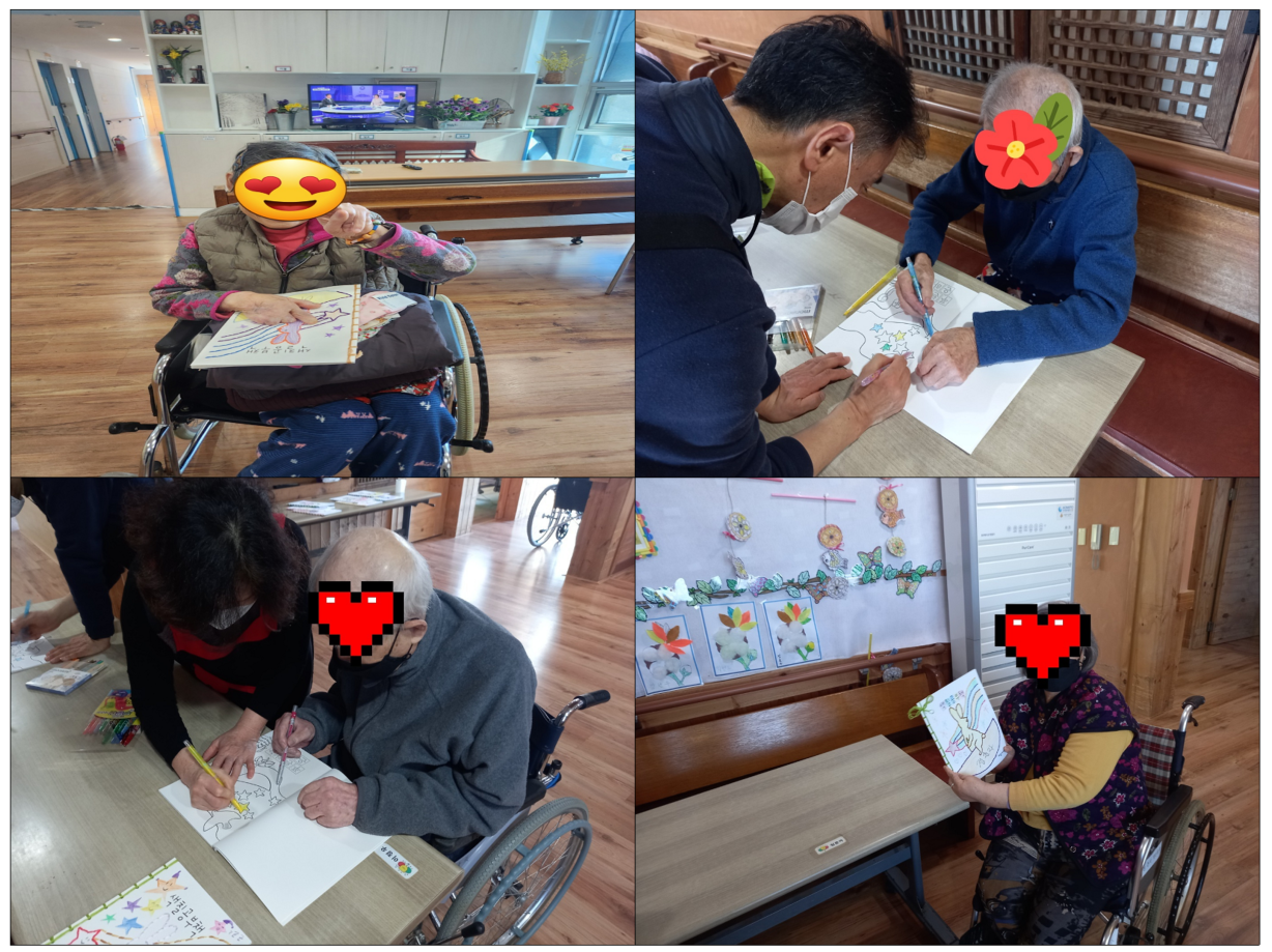 우리 어르신들이 행복해하시는 모습을 보니 세상아이 관계자 여러분들께 진심으로 감사함을 보냅니다. 너무너무 감사합니다. 요즘 날씨가 너무 추워 밖으로 나가기도 어렵고 하였는데 예쁜 색칠공부책을 보내주시니 좋은 시간을 보내도록 하겠습니다.