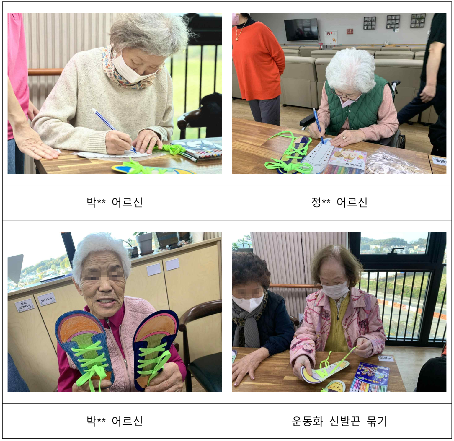 정** 어르신 : 운동화 색을 예쁘게 색칠해 주어서 덕분에 멋진 신발이 완성되었다고 하셨고, 다음에도 이런 활동을 또 하고싶다고 하셨습니다. 완성 후에는 알록달록 신발을 얼굴 양옆에 붙여서 사진 촬영도 하셨답니다. 어르신을 위한 다양한 활동을 위해 또 제공해드리고 싶네요.
