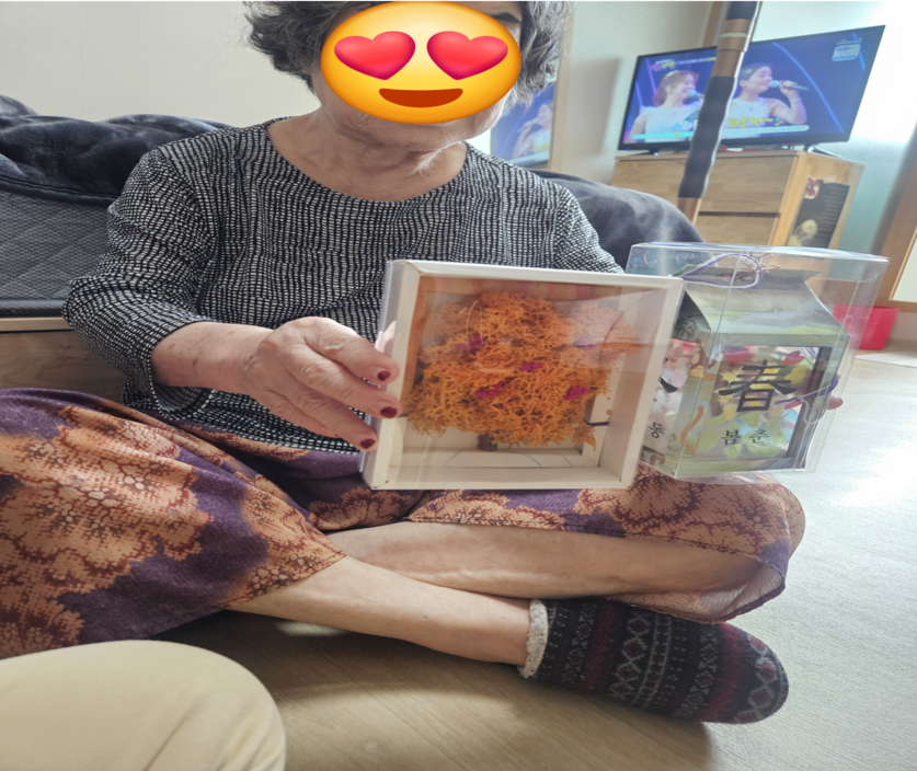저희 방문요양센터 5등급 어르신인 우** 어르신께 수령한 물품을 전달해드리고 어르신과 함께 기억상자 안에 있는 주사위놀이를 해 보았습니다. 우리 어르신 성격이 뭐든지 긍정적으로 받아들이고 수용하시는 분이라 치매로 인해 게임의 의미를 완전히 이해하지는 못할지라도 즐겁게 진행할 수 있었습니다. 또 무드등과 모스액자를 보여드리니 너무 이쁘다고 하시고, 자원봉사자들이 만들어 기부해준 물품이라고 말씀드리니 이쁘게 만드느라 수고가 많았다고 하시네요. 무드등은 밤에 켜놓겠다고 하십니다.